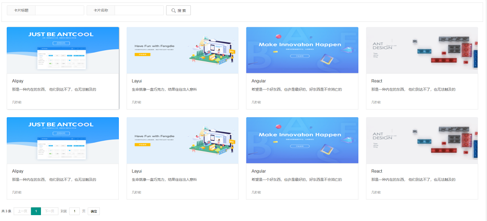 简单了封装了一个卡片式的表格,参考pear-admin的卡片界面,在此感谢; 组件目前用于WaterCloud框架中,后端Net5,前端layui,开源MIT协议。 演示地址在:https://watercloud.vip/page/cardTable.html