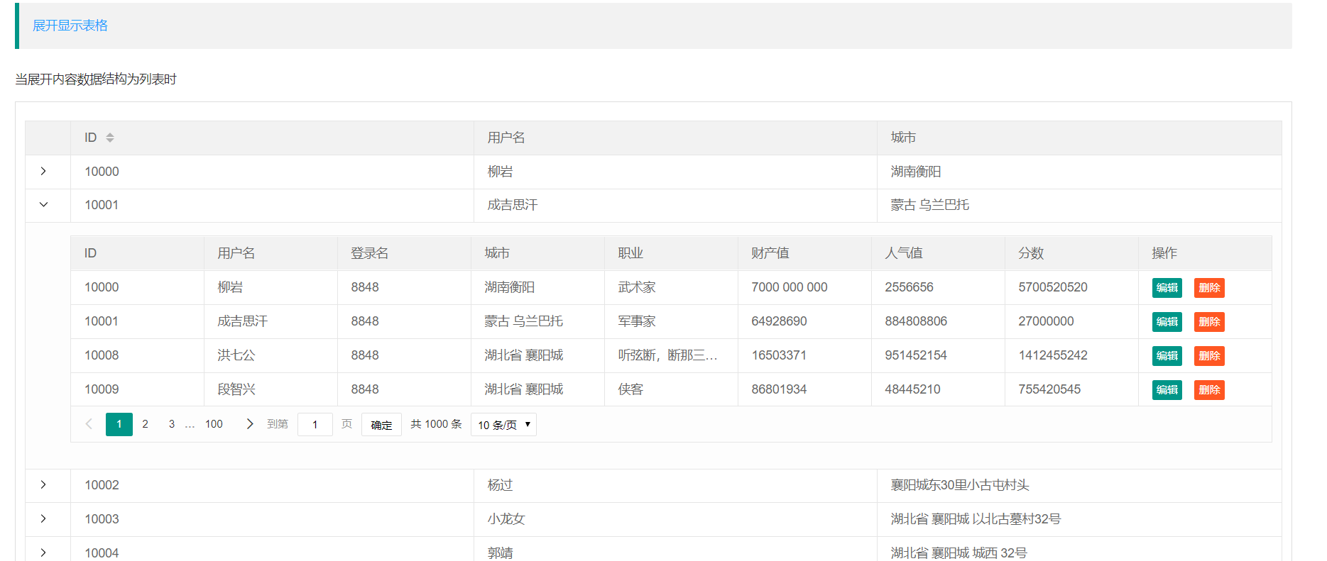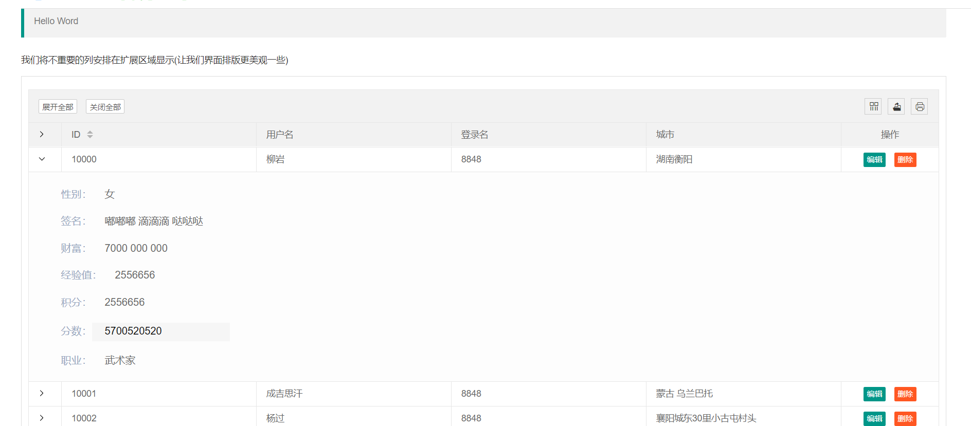 展开区域显示表格