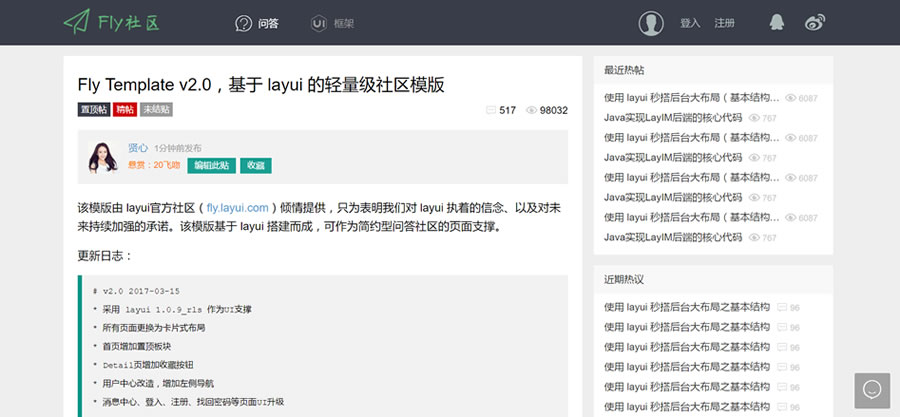 Fly Template 由 layui官方社区( Fly社区 ) 倾情抽取,基于 layui 搭建而成,提供了全屏和固宽两类排版,并且具备响应式适配能力,可很好地作为简约型问答社区的页面模版支撑 全屏风格 模版提供了全屏风格,你可以打开 html/full.html预览效果 使用全屏风格只需在原有css的基础上,引入 css/full.css即可
