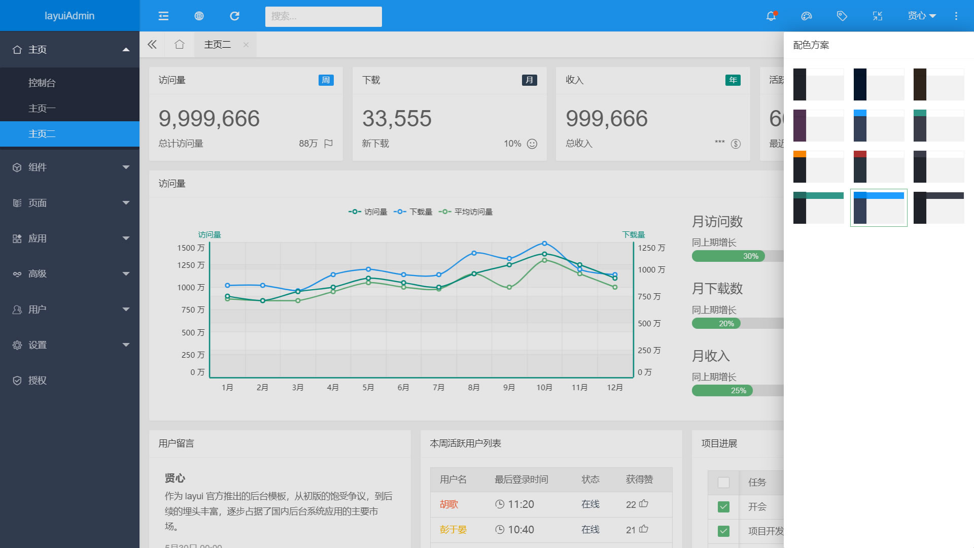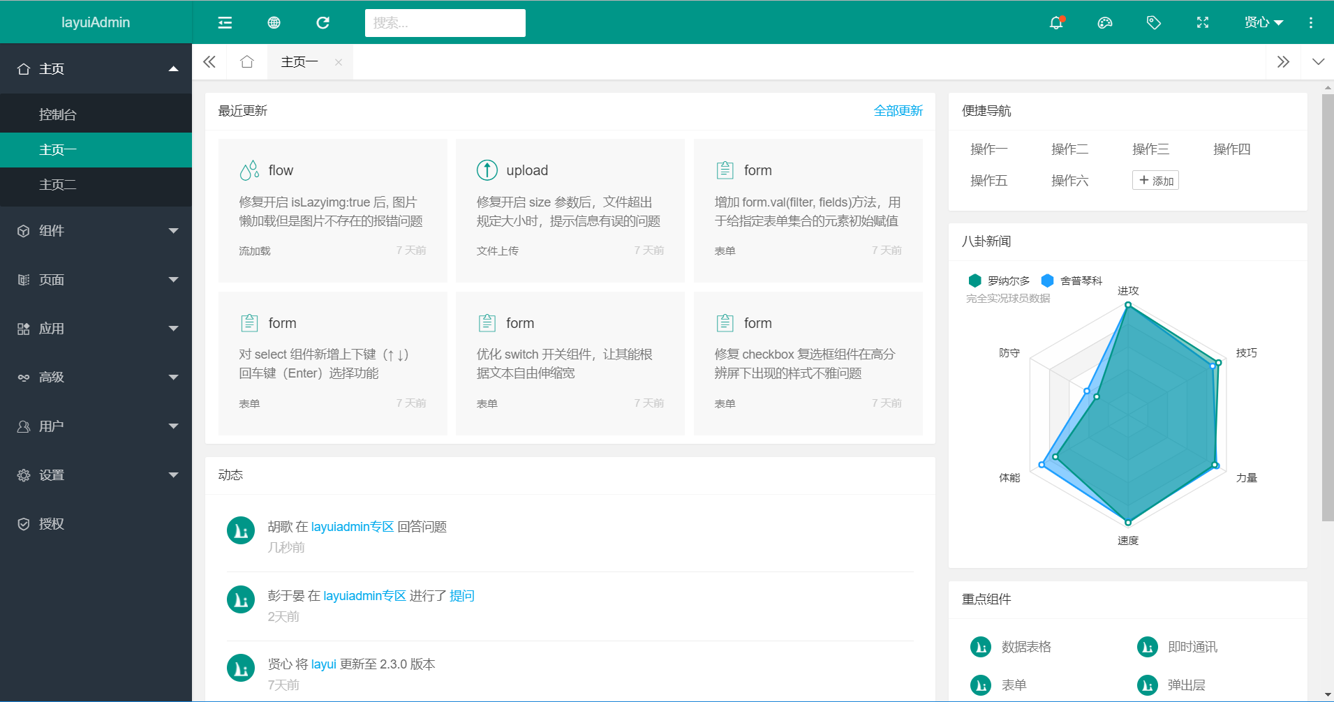 layuiAdmin 是一套基于 layui 的用于开发各类管理系统的通用型纯静态网页界面模板,在原有 layui 的基础上,重点升级了 layout 布局方案,以及对内置的 UI 组件在各类实际业务场景下进行相对丰富的页面模板示例。