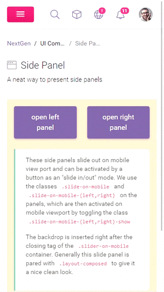 on the panels, which are then activated on mobile viewport by toggling the class .slide-on-mobile-{left,right}-show